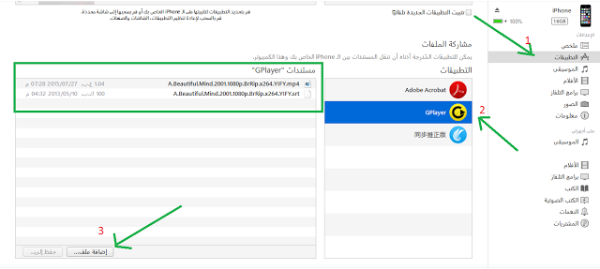 الأن ستنتقل إلى التطبيقات ومن ثم تنزل إلى الأسفل قليلا حتا تجد مشاركة الملفات إختر أو إنقر على البرنامج الذي قمت بتنزيله على سبيل المثال برنامج Gplayer كما موضح بالصورة أعلاه ومن ثم إختر إضافة ملفات وإختر الفلم وملف الترجمة الذي قمنا بتنزيلهما .